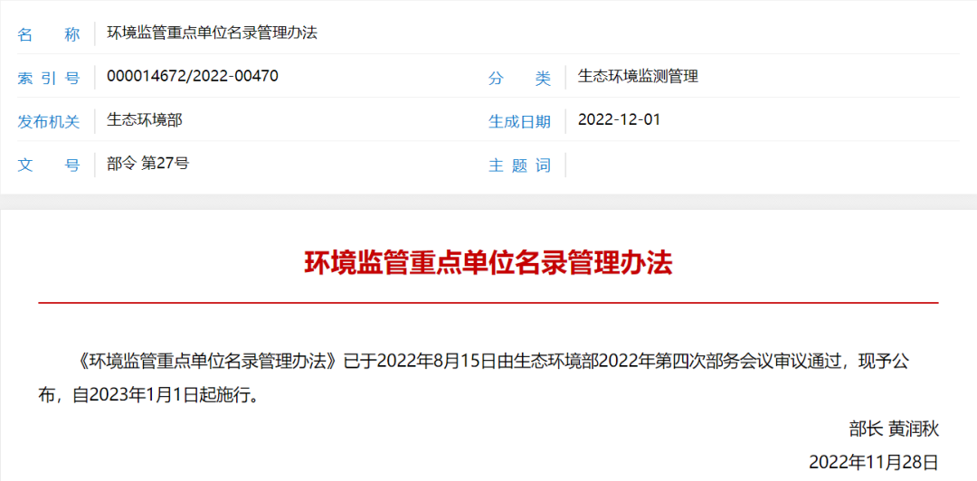 12月1日,生態(tài)環(huán)境部發(fā)布《環(huán)境監管重點(diǎn)單位名錄管理辦法》(部令第27號),進(jìn)一步明確了重點(diǎn)排污單位名錄的確定和發(fā)布。《辦法》將于2023年1月1日起施行。有哪些單位要被列為重點(diǎn)排污單位呢?省市兩級生態(tài)環(huán)境主管部門(mén)要承擔哪些職責呢?