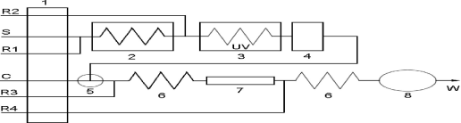 1 蠕動(dòng)泵 2 加熱池(95℃) 3 紫外消解裝置 4除氣泡裝置 5 注入閥 6 反應圈 7 鎘柱 8 檢測池10mm 540nm R1 消解溶液(5. 16) R2 四硼酸鈉緩沖溶液 (5. 17) R3 氯化銨緩沖溶液(5. 18) R4 顯色劑(5.19) C 載液(5.27) S 試樣W 廢液